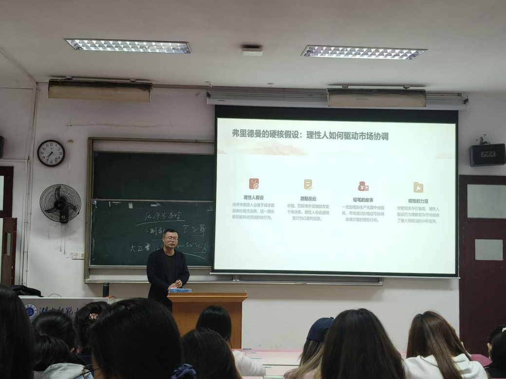 讲解过程中,王老师将经典经济学理论与数字时代的新特征相结合,层层递进、深入浅出地解析了不同时期经济学的研究核心与变迁脉络。现场同学认真聆听、积极思考,沉浸在浓厚的学术氛围中。