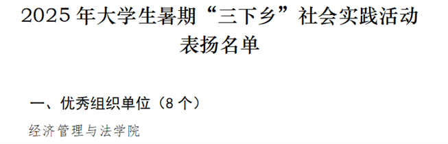 在湖北师范大学2025年暑期大学生“三下乡”社会实践活动中,经济管理与法学院师生锚定乡村振兴、基层法治、社会服务、文化传承等国家战略需求,将专业所学与实践所需深度融合,在田野间践行初心,在服务中锤炼本领,最终在学校2025年大学生暑期“三下乡”社会实践中斩获多项荣誉,充分展现出经管法学子为中国式现代化挺膺担当的坚定信念和青春风采。
