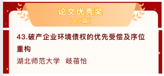 近日,从第四届长江大保护司法论坛上传来佳音,我校经管法学院2024级法律硕士研究生岐蓓怡同学撰写的学术论文在本次论坛主题征文活动中荣获“优秀奖”。该论坛由湖北省高级人民法院、长江海商法学会、武汉大学、华中科技大学、中南财经政法大学、人民法院环境资源审判理论研究(武汉大学)基地共同举办,是环境资源司法领域的高水平学术盛会。