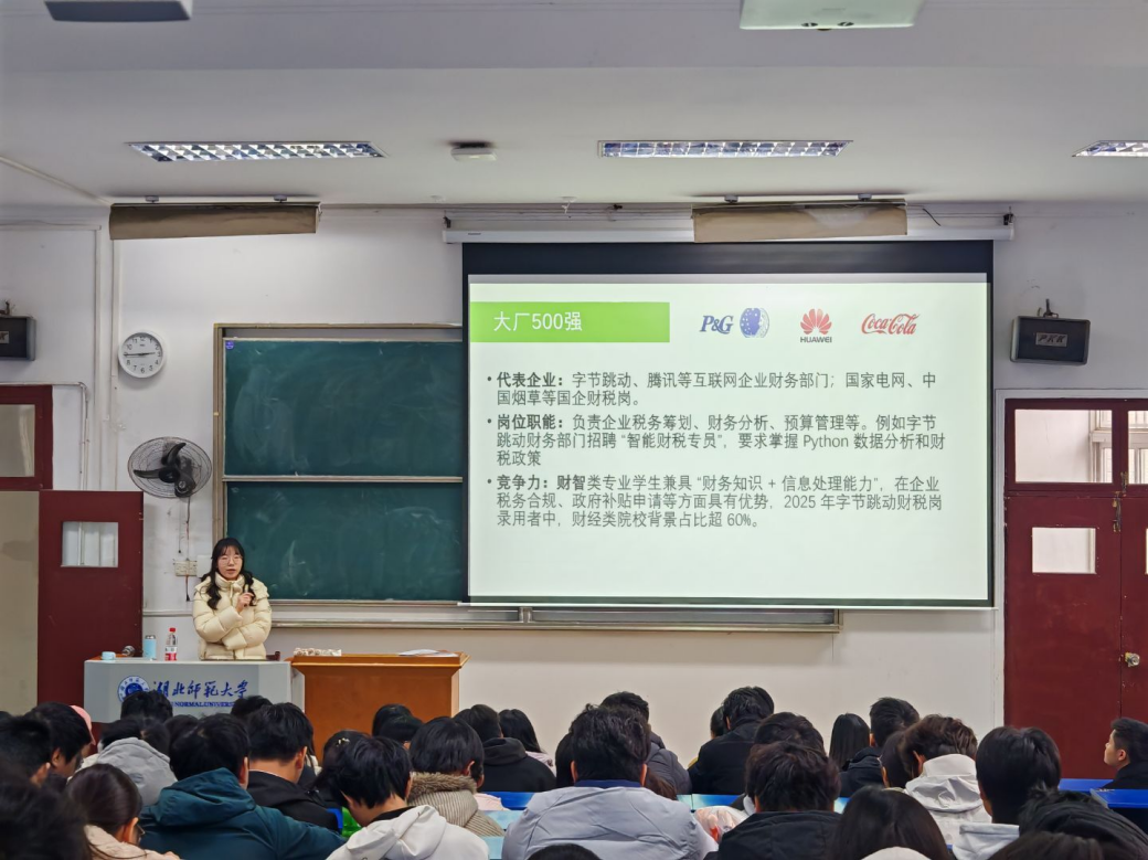 为帮助经济学与财务管理专业学生深化专业认知、科学规划大学生涯,经济管理与法学院于12月4日下午在教育大楼1J21教室举办经济学与财务管理专业大学生职业生涯规划讲座。本次活动特邀高顿教育徐老师担任主讲,24级与25级经济学专业、财务管理专业百余名学生齐聚一堂,在干货满满的分享中开启大学生涯探索之旅。