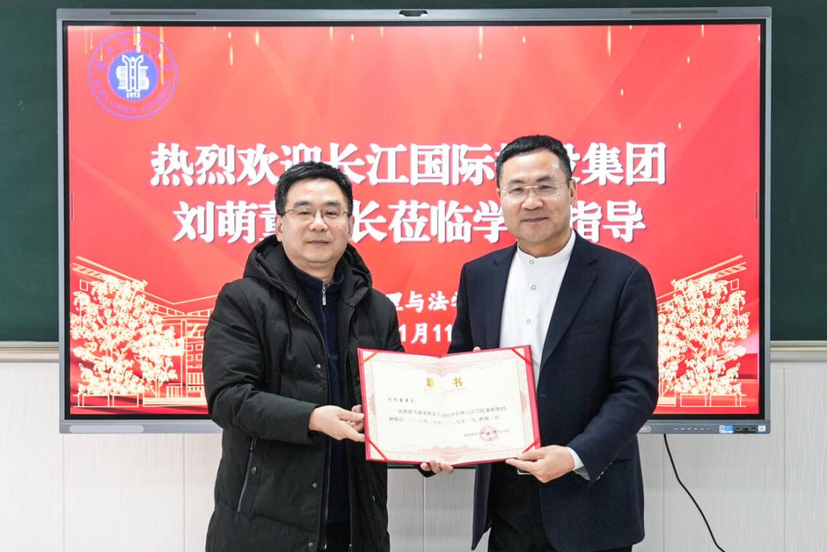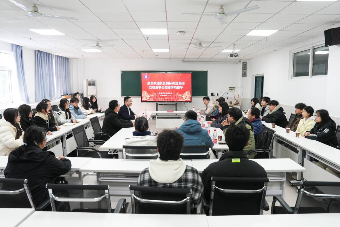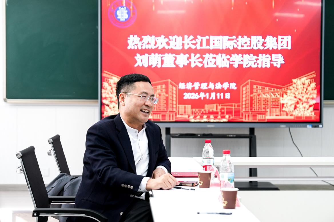 2026年1月11日上午,长江国际控股集团有限公司刘萌董事长出席湖北师范大学经济管理与法学院“名企领袖面对面”师生座谈会,学院党委书记邓光君、师生代表参加座谈会,共同深化产教融合交流、推动实践育人走深走实。