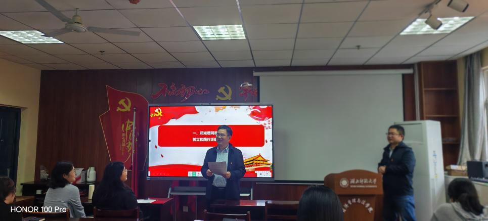 会上,在完成交纳党费、重温入党誓词和集体诵读党章等规定动作后,支部为四月份入党的汪火良、叶亮军、明星和戴欢欢四位同志过政治生日。在集中学习环节邓光君、沈燕、侯彩云、王小丹等同志分别领学了树立和践行正确政绩观、从中国式现代化理论领悟为什么中国一定能成功、中国共产党党员网络行为规定、中华人民共和国国家安全法等重要文献及学习教育材料。随后,熊丽萍、饶晶同志结合教师党员身份,围绕如何把正确政绩观与教学结合,引导学生树立科学治理理念,如何做国家安全的坚定维护者和积极宣传者进行了交流。